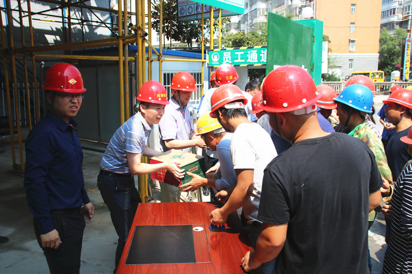 近期,連日高溫,驕陽似火,為保證施工進(jìn)度,奮戰(zhàn)在一線的項目職工戰(zhàn)高溫、斗酷暑,在滾滾熱浪中保質(zhì)保量、高效地完成著施工生產(chǎn)任務(wù)。為做好防暑降溫工作,保障一線員工的健康權(quán)益,信陽市住房和城鄉(xiāng)建設(shè)局副局長陳弋明攜市城建監(jiān)察支隊隊長蔡維全及城建監(jiān)察人員一行不畏酷暑,來到我公司湖東春天項目部,為奮戰(zhàn)在一線的廣大員工送去了絲絲涼意,還有端午佳節(jié)的親切問候。