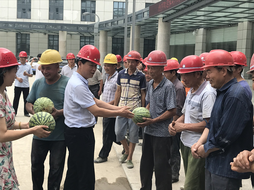 張國棟院長一行將礦泉水、西瓜等防暑降溫物品送到大家手中,叮囑大家在緊張施工中,一定要注意防暑降溫,注意施工安全,一句句真切的話語,表達(dá)出對(duì)一線職工深深的惦念。此次慰問活動(dòng)給廣大戰(zhàn)斗在一線的工人們帶去了一絲清涼、一縷關(guān)懷,進(jìn)一步營造了和諧穩(wěn)定的良好氛圍。