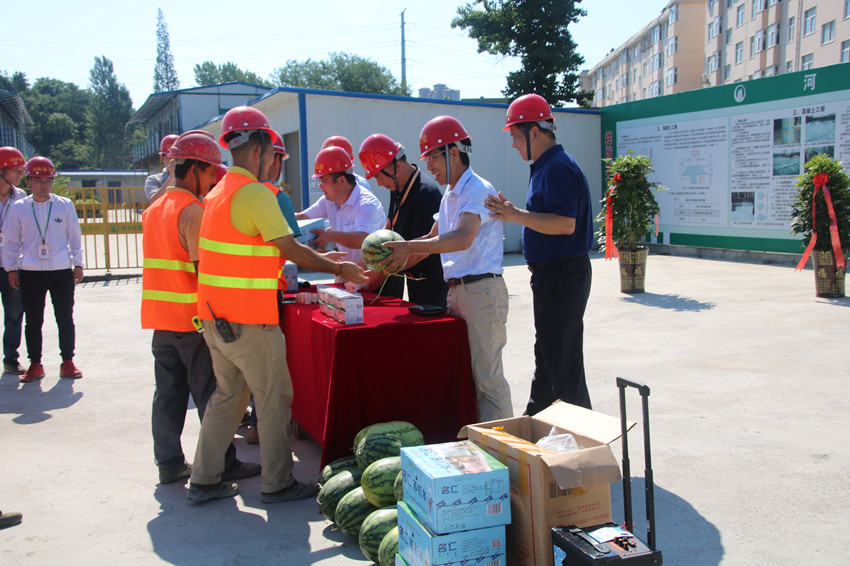 隨后,信陽市政府、住建局、揚塵治理攻堅辦、安監(jiān)站、質(zhì)監(jiān)站等主要領導及建筑業(yè)同行來到現(xiàn)場觀摩會分會場(我公司承建的信陽南灣琨御府項目)參觀,住建局張奔局長還代表信陽市住建局向項目部農(nóng)民工發(fā)放了慰問品。