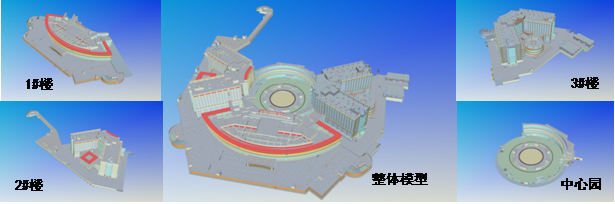 采用GCL軟件創(chuàng)建,分為:1#樓土建模型、2#樓土建模型、3#樓土建模型、中心園土建模型(圖2)。機(jī)電模型采用Revit MEP軟件創(chuàng)建,按照分層、分專業(yè)建模的方式進(jìn)行。