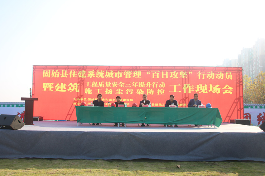 11月1日上午,固始縣住建系統(tǒng)城市管理“百日攻堅”行動動員暨建筑工程質量安全三年提升行動施工揚塵污染防控工作現(xiàn)場會在公司承建的固始縣人民醫(yī)院項目現(xiàn)場召開。本次現(xiàn)場會由固始縣住建局局長孟凡杰主持召開,共計四百余人參加了會議,參加會議的有:固始縣住建局副局長汪明昌、公司副總經(jīng)理吳建功、河南新旭建筑工程有限公司固始分公司總經(jīng)理楊嶺、固始縣信合集團公司固始事業(yè)部總經(jīng)理黃全;固始縣住建局相關股室主要負責人、縣內(nèi)各在建項目建設單位項目負責人,監(jiān)理單位主要負責人、項目總監(jiān),公司各在建項目經(jīng)理、質檢員、安全員、揚塵治理專管員、施工現(xiàn)場揚塵治理“三員”等。