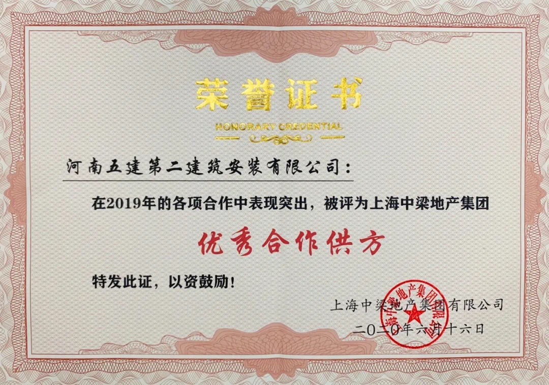 公司榮獲上海中梁地產(chǎn)集團優(yōu)秀合作供方獎