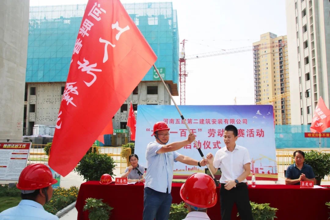 儀式開始后,吳部長首先宣讀了《河南五建二公司在建項目“大干一百天”勞動競賽實施方案》。此次競賽活動共有11個主體在建的項目部參加,公司對此次活動高度重視,成立了以吳萬仁董事長為主任的勞動競賽組委會,全面負(fù)責(zé)競賽工作的部署、督促、檢查及評比。此外,公司還對本次競賽活動的目標(biāo)、范圍、內(nèi)容以及競賽評價、總結(jié)表彰等工作進(jìn)行了詳細(xì)的策劃和安排。佳和熙岸項目部負(fù)責(zé)人蔡旺軍代表競賽項目部做了發(fā)言,呼吁所有競賽項目要為此次競賽活動取得圓滿成功而不懈努力。公司副總經(jīng)理吳建功對競賽活動提出具體的工作要求,他在講話中提到此次競賽活動的重要意義,要求所有參與者都要提高思想站位,高度重視,各競賽項目、機(jī)關(guān)各部門以及勞動競賽組委會要各專所長、密切配合,充分發(fā)揮創(chuàng)新引領(lǐng)作用,積極完成此次“大干一百天”勞動競賽活動。