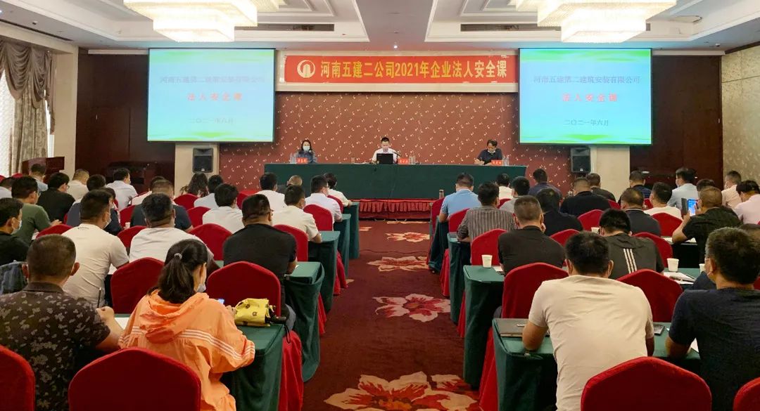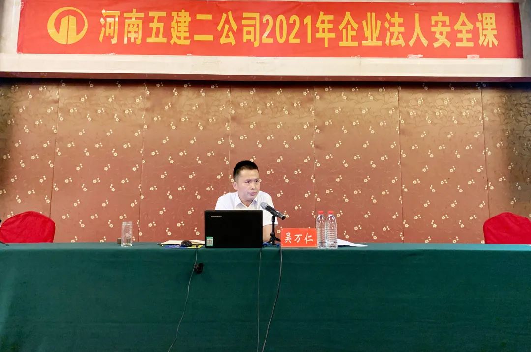 為全面深入開展第20個全國“安全生產(chǎn)月”活動,日前, 河南五建二公司在中樂百花酒店三樓會議廳舉辦了2021年企業(yè)法人安全課,公司董事長、總經(jīng)理吳萬仁以法人代表的身份親自授課。公司董事會、經(jīng)理班子成員、各部門、二級機(jī)構(gòu)負(fù)責(zé)人及各項目部項目經(jīng)理、技術(shù)負(fù)責(zé)人、專職安全管理人員等共一百余人參加了課程。