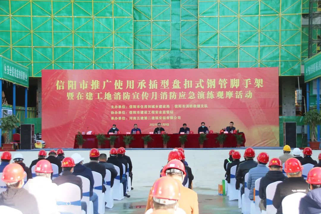 11月9日,在第三十個(gè)全國消防安全宣傳教育日來臨之際,公司第七項(xiàng)目部承建的太古·湖畔樾山項(xiàng)目迎來尊貴的客人,信陽市推廣使用承插型盤扣式鋼管腳手架現(xiàn)場(chǎng)觀摩會(huì)暨消防應(yīng)急演練活動(dòng)在項(xiàng)目現(xiàn)場(chǎng)隆重舉行。信陽市住建局黨組副書記、副局長張奔、安監(jiān)站站長馬其峰、副站長楊傳臣、信陽市消防救援支隊(duì)副隊(duì)長王偉等領(lǐng)導(dǎo)親臨活動(dòng)現(xiàn)場(chǎng),公司黨委書記、董事長吳萬仁受邀出席活動(dòng)并講話。整場(chǎng)活動(dòng)由會(huì)議階段、演練階段和觀摩階段三部分組成,由安監(jiān)站站長馬其峰負(fù)責(zé)主持。